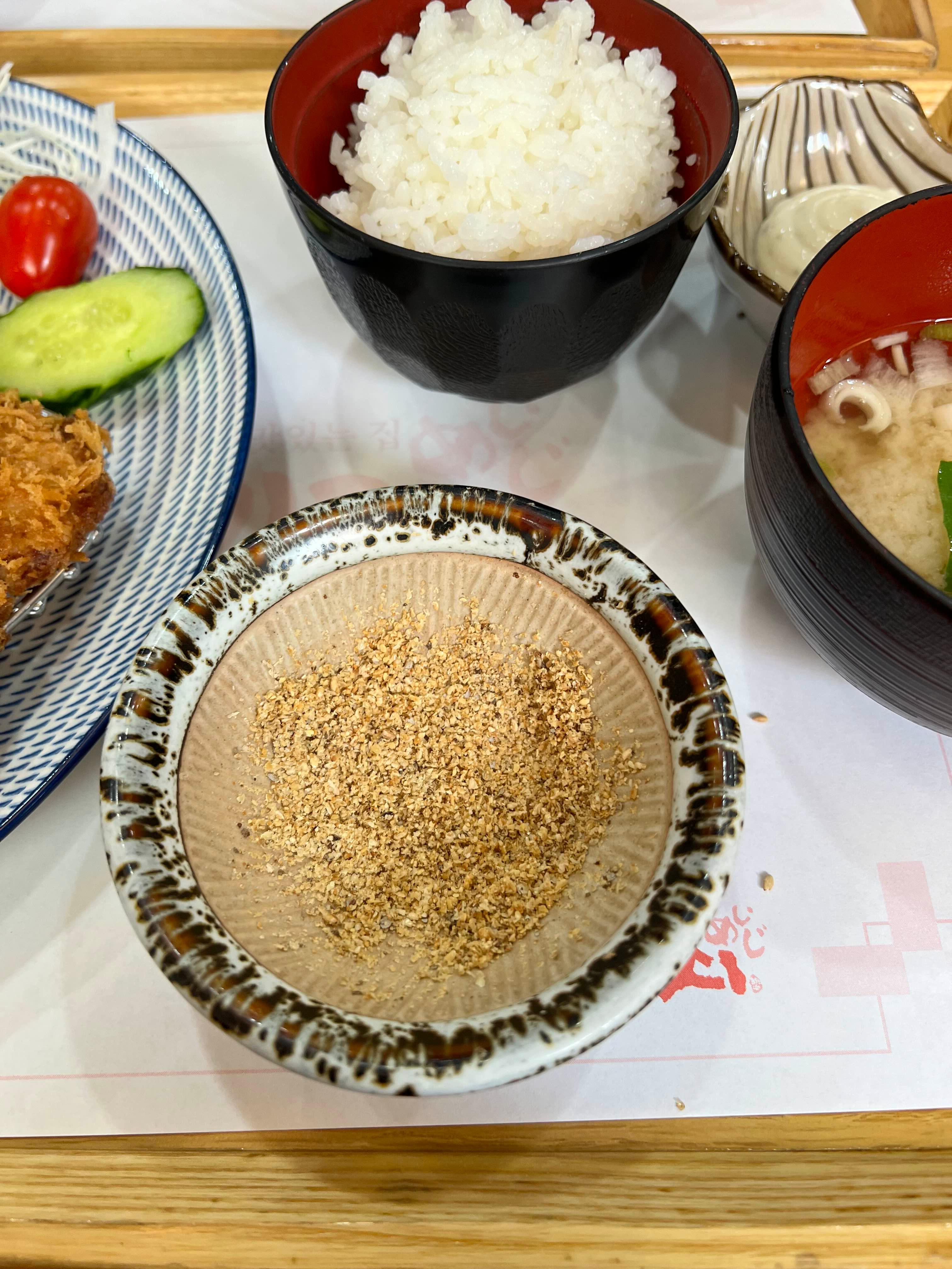 깨를 으깨서 돈가스 소스 그릇에 부으면 고소한 풍미가 확 올라가서 더 맛있어요!