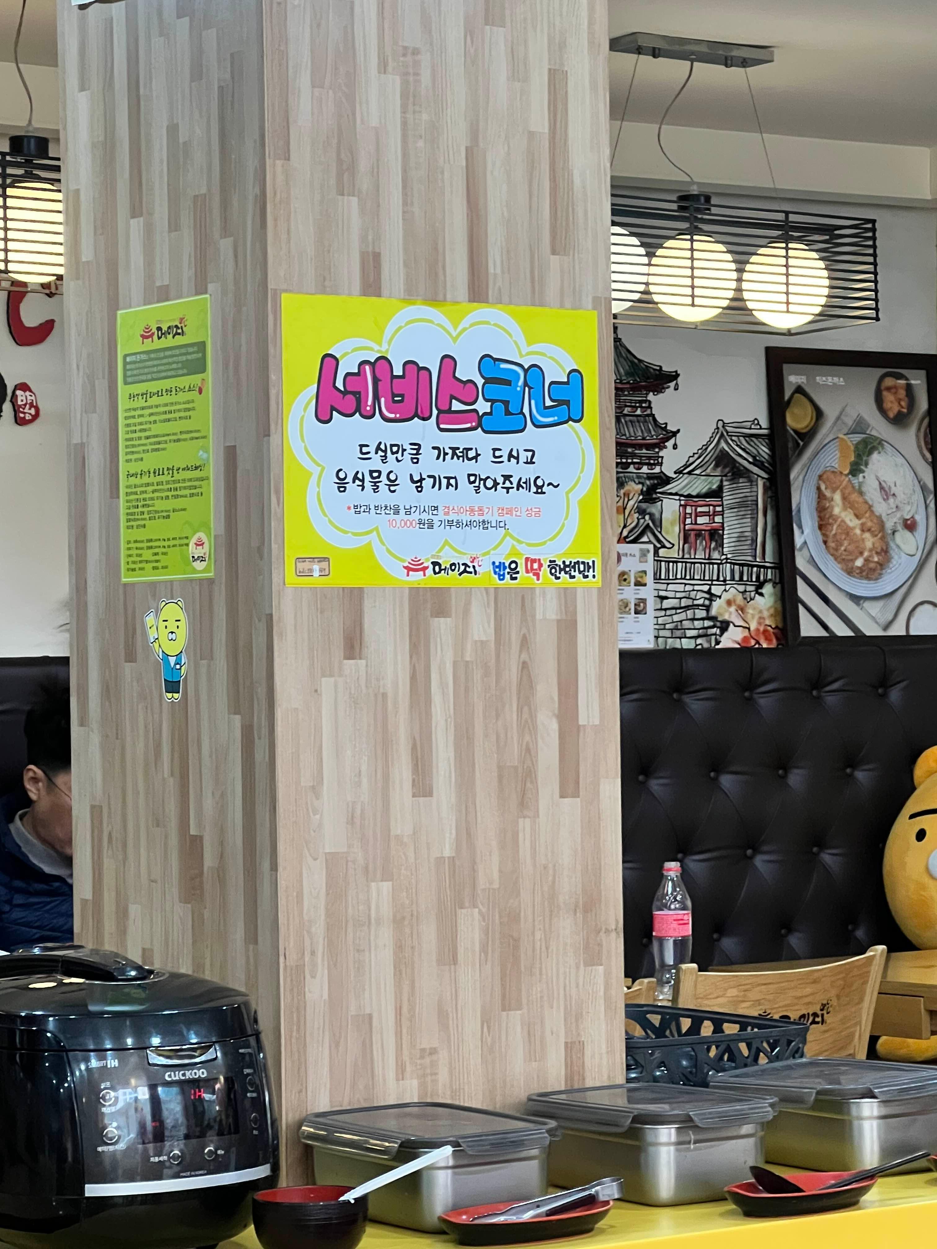✅ 물과 각종 반찬 → 셀프 코너에서 직접 가져오기