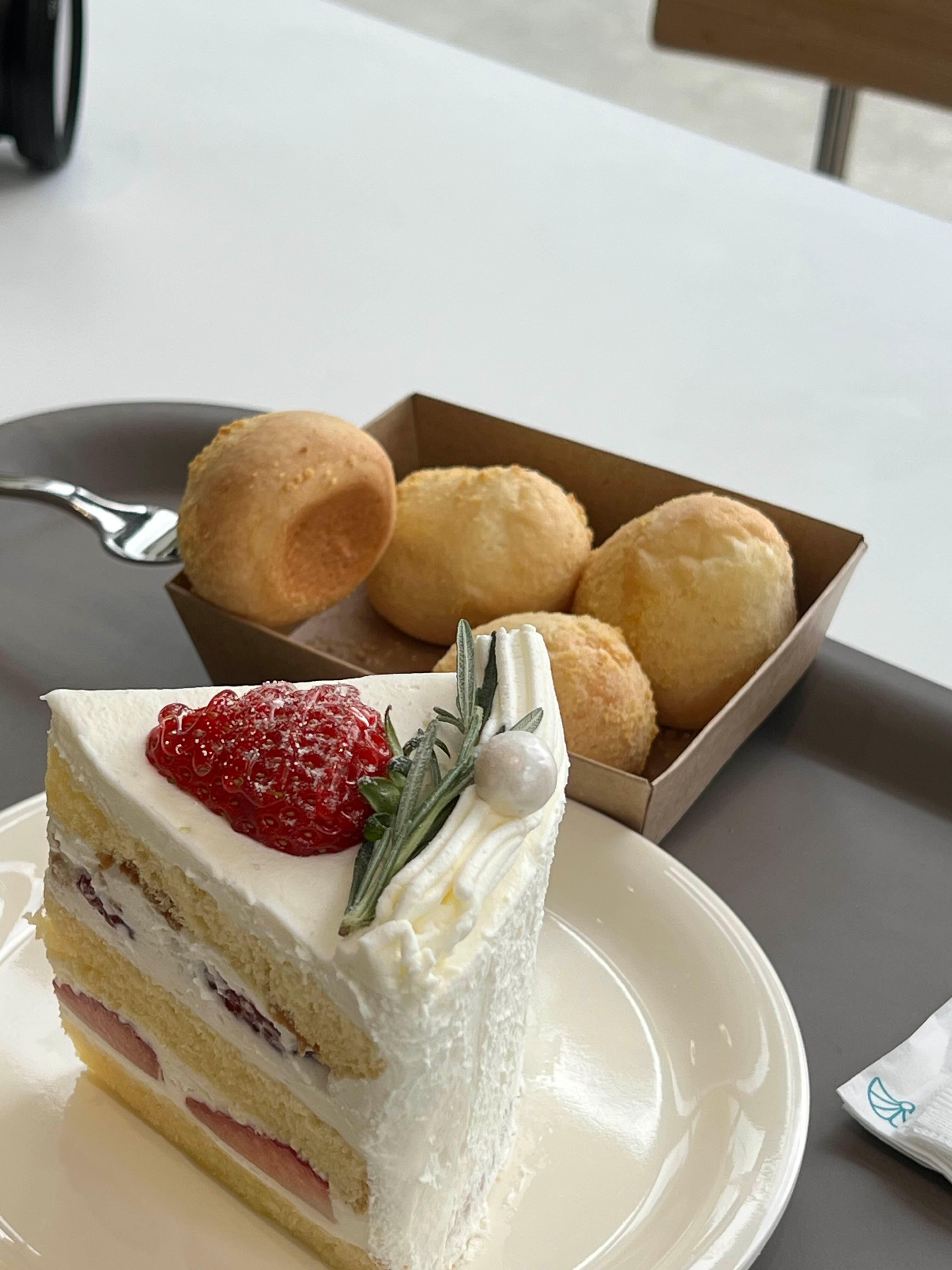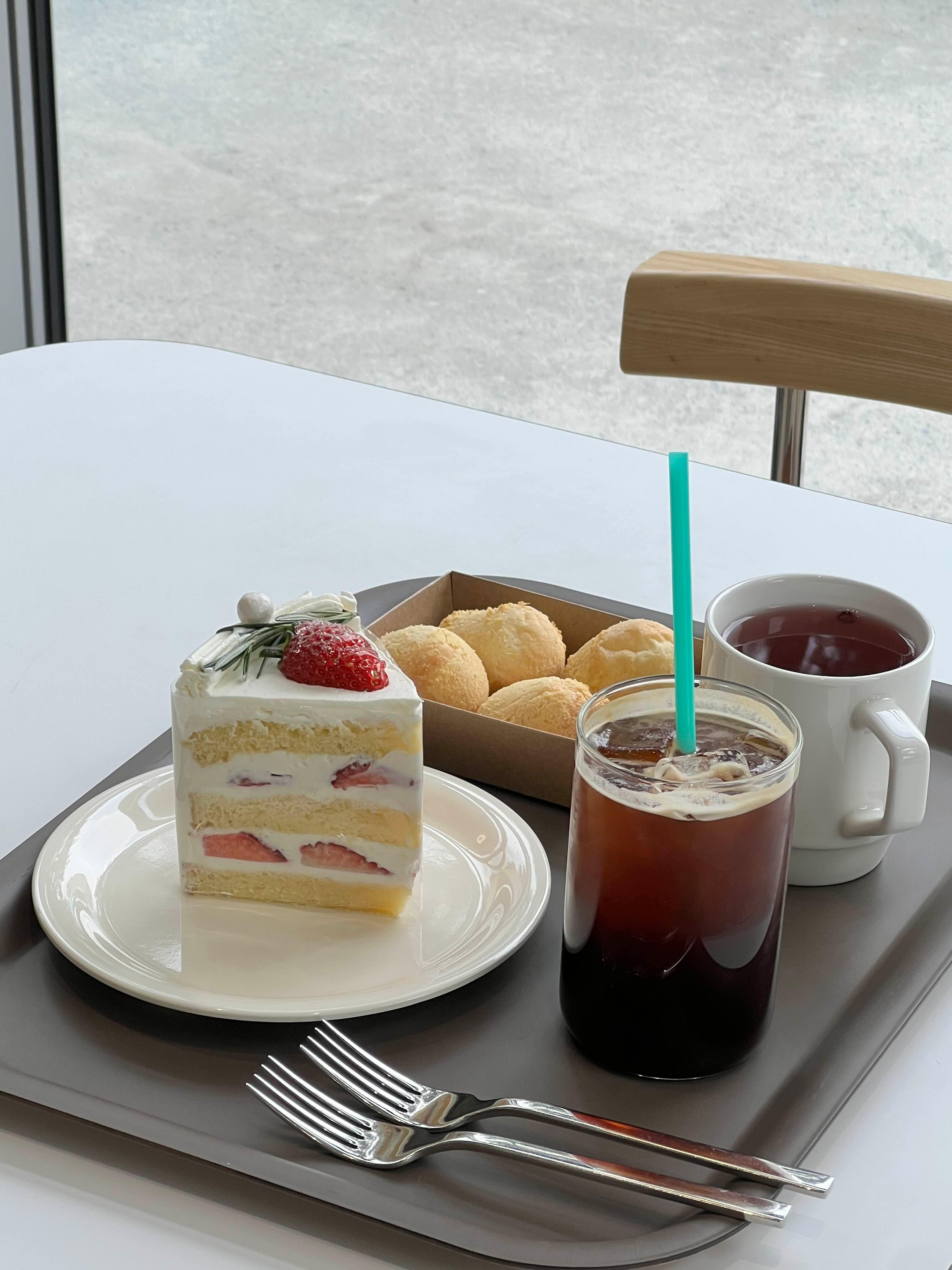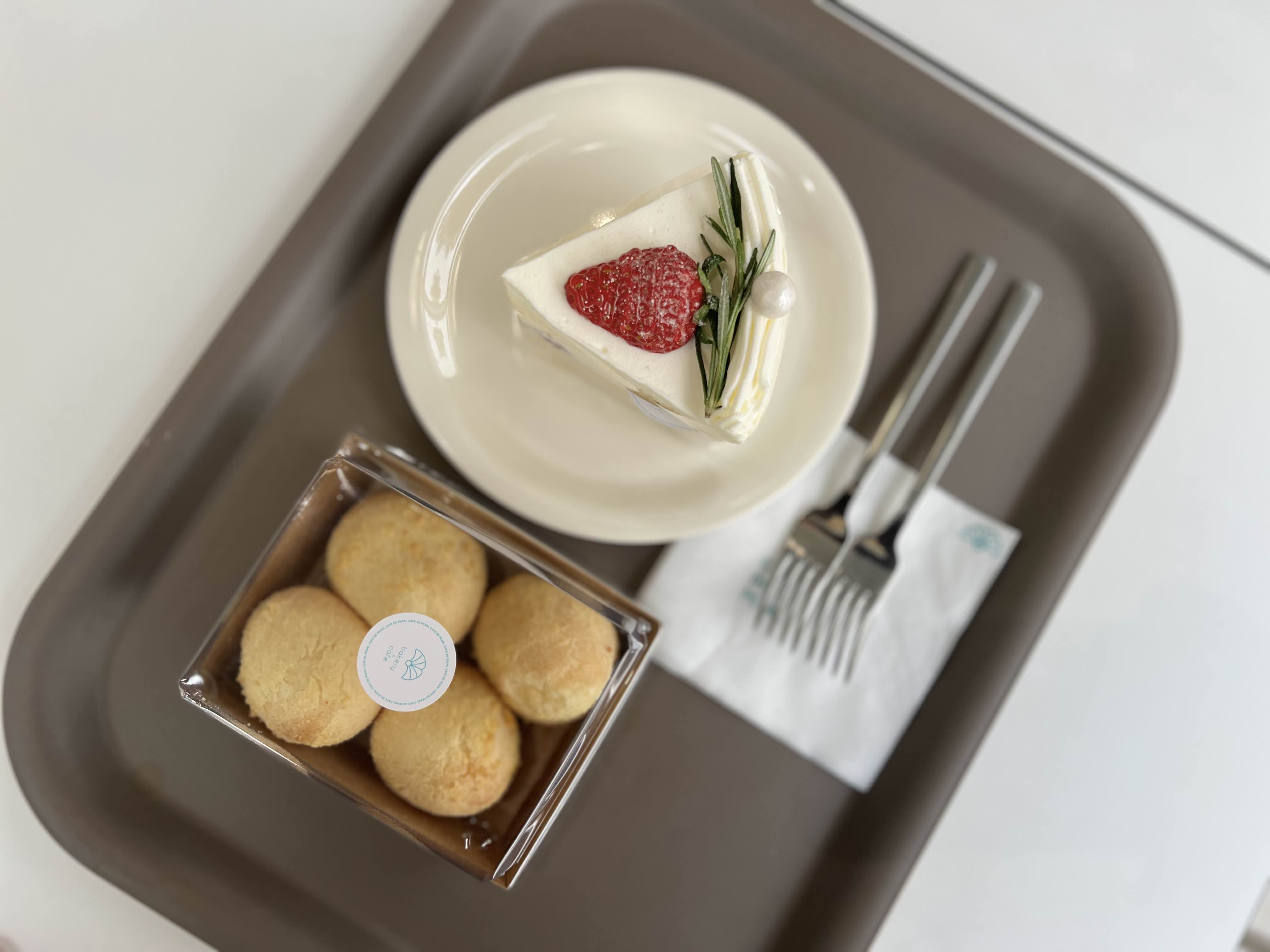 저는 이날 오미자차 / 딸기케이크 / 진주오리궁딩이빵 이렇게 3가지 주문했어요!
