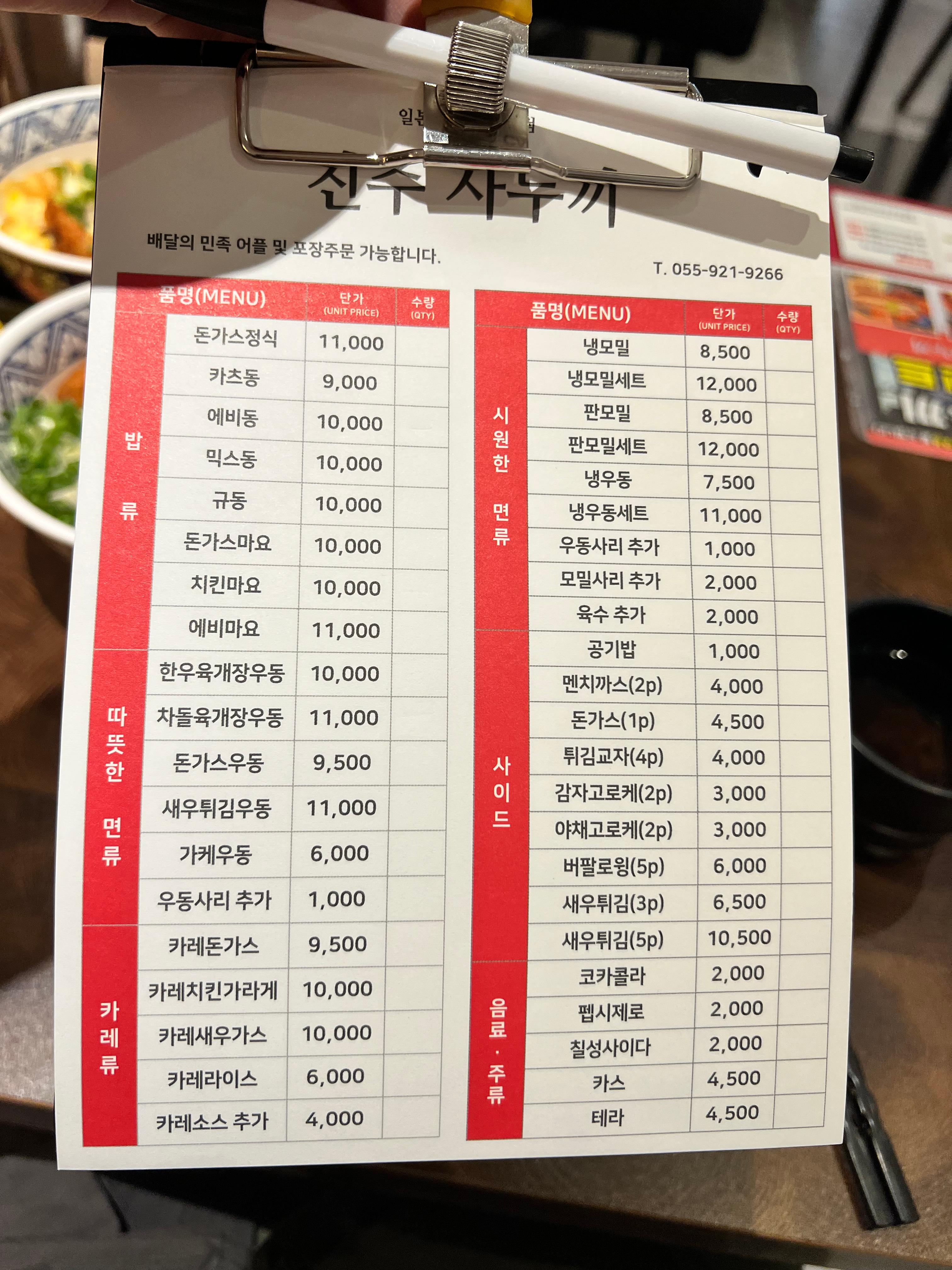 돈가스정식은 11,000원, 에비마요는 11,000원, 냉우동은 7,500원, 냉모밀은 8,500원 정도였고