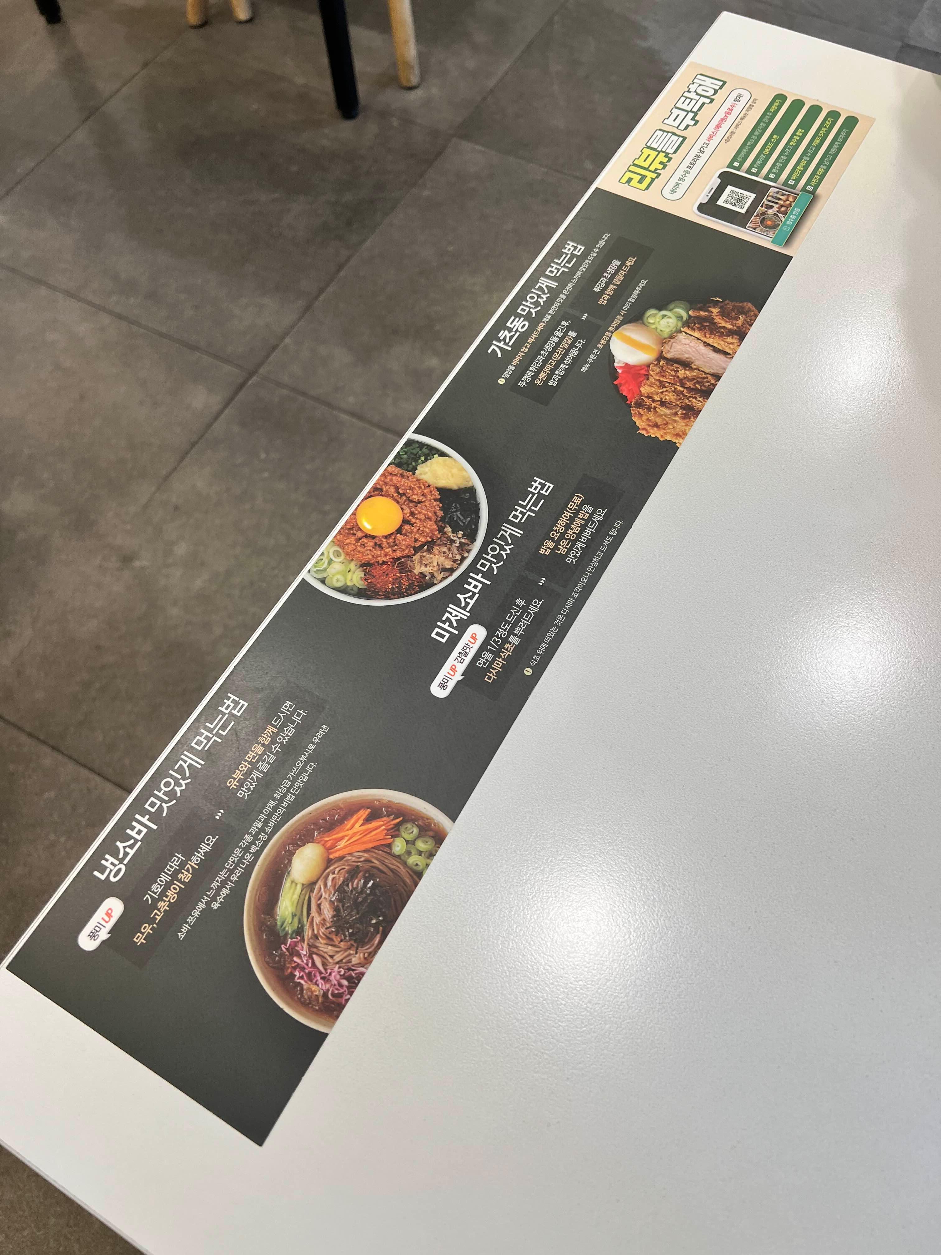 테이블마다 ‘맛있게 먹는 방법’이 안내되어 있어서 꼭 참고해보세요. 마제소바는 1/3쯤 먹고 다시마 식초를 넣으면 풍미가 완전히 달라져요. 소바는 와사비와 함께, 돈카츠는 요청하면 와사비도 따로 줍니다. 이런 디테일이 꽤 마음에 들었어요.