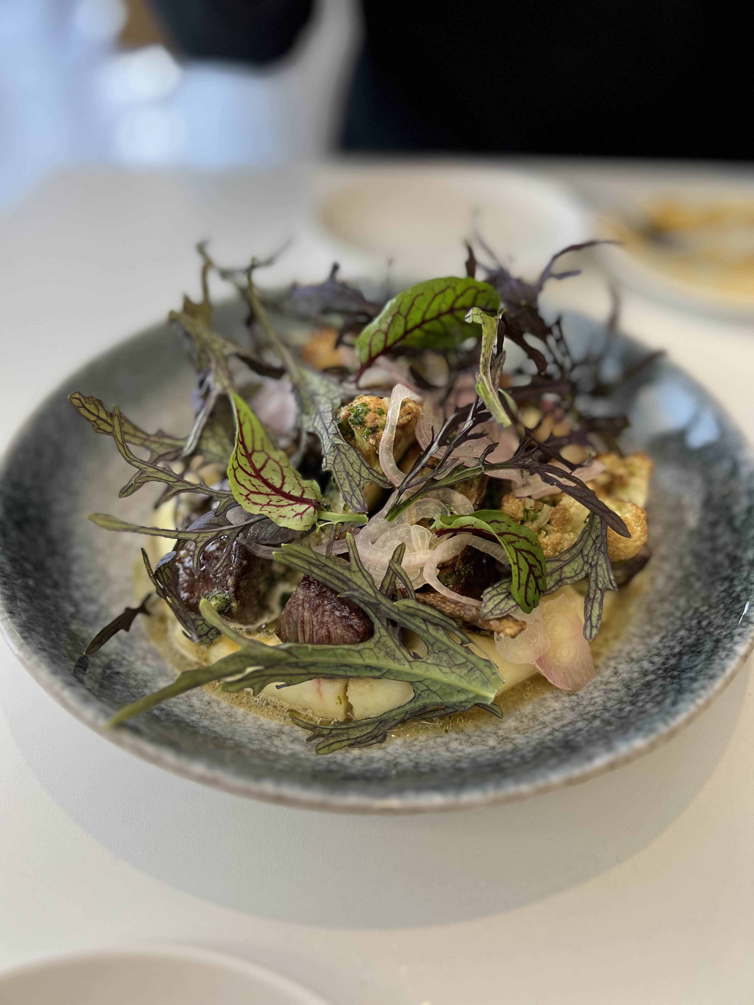 - 이어 나온 큐브 스테이크는 정말 특이하게 생겼죠? 겨자 잎으로 가니쉬를 했더라구요 ! 부드러운 육질과 풍부한 육즙이 입안 가득 퍼지며 한정 메뉴다운 특별함을 느끼게 했어요.