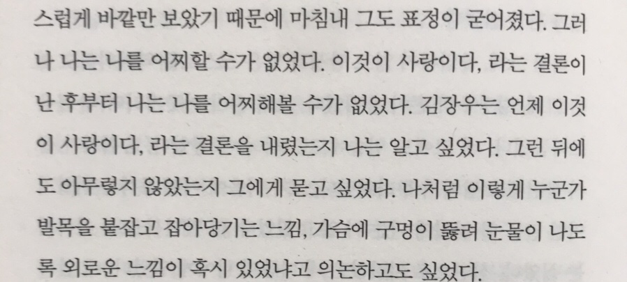 그리고 마지막 사진은 내가 제일 좋아하는 부분이다. 글의 화자이자 주인공인 '안진진'이 일생 처음 사랑을 느끼면서 괴로워하는 장면이다. 나는 이 장면을 굉장히 좋아한다. 누군가 나에게 사랑이 무엇인가요? 묻는다면 저 문장 자체를 얘기하고 싶다. 그정도로 마음에 쏙 들었다.